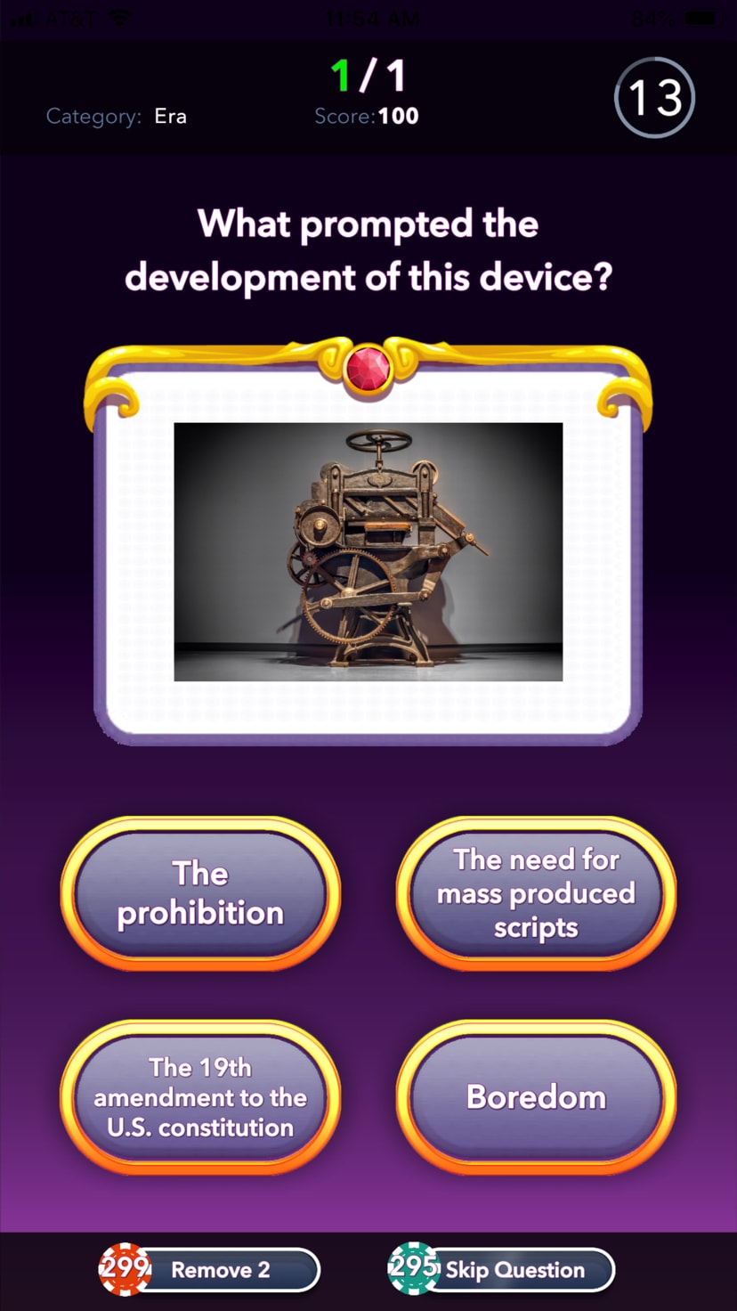 Once you select a game mode (single or 1 v 1), the game begins! You will be asked a series of random questions that fall into “Identity”, “Era”, “Purpose”, or “Bonus” categories. Guess Matchers will have three opportunities to guess the answers.